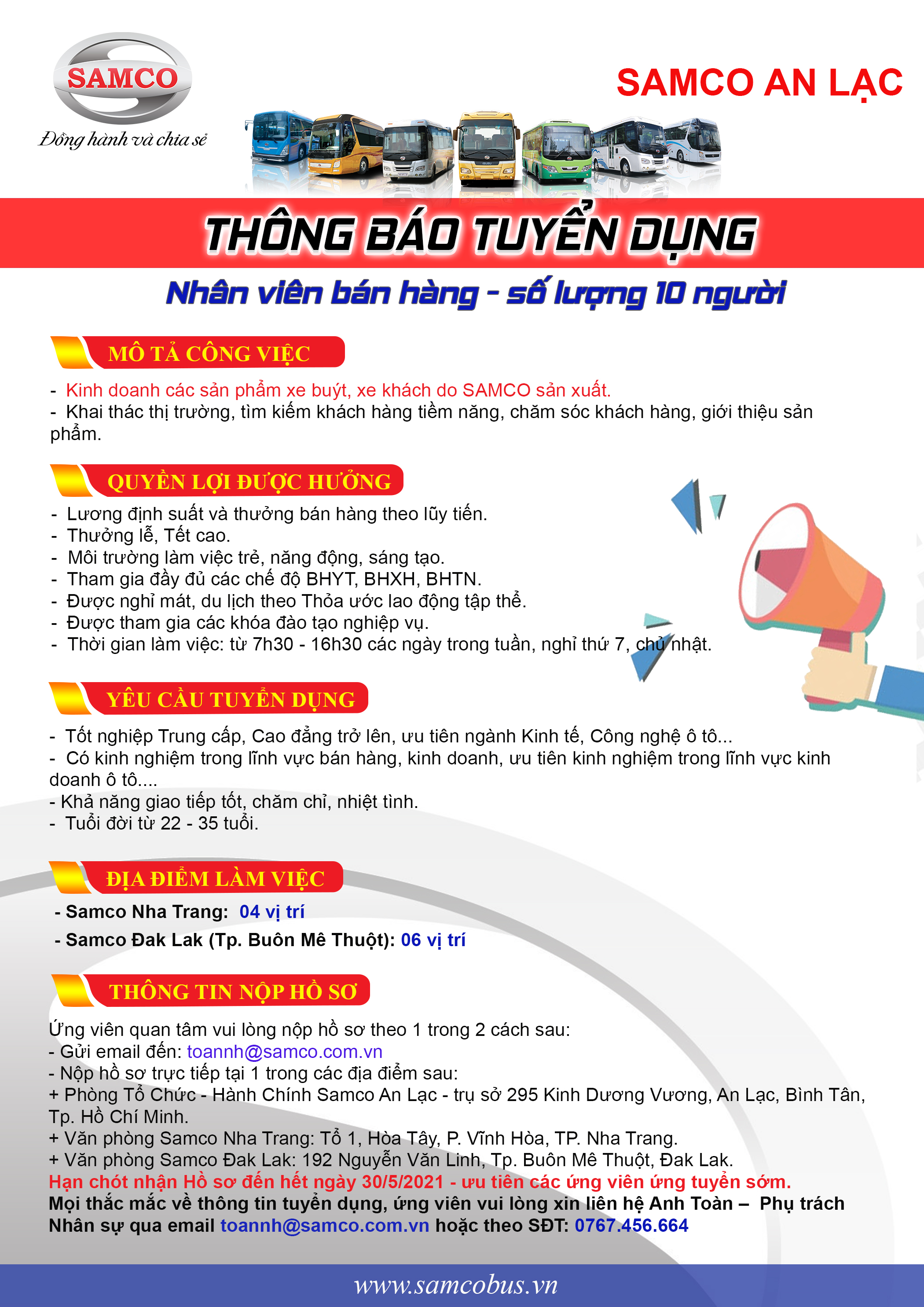 - Ứng viên ứng tuyển các vị trí nhân viên bán hàng tại Samco Nha Trang và Samco Đak Lak vui lòng liên hệ Anh Toàn - 0767.456.664 hoặc gửi hồ sơ qua email: toannh@samco.com.vn.