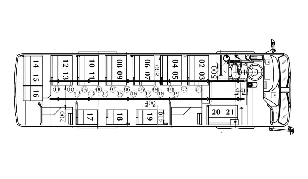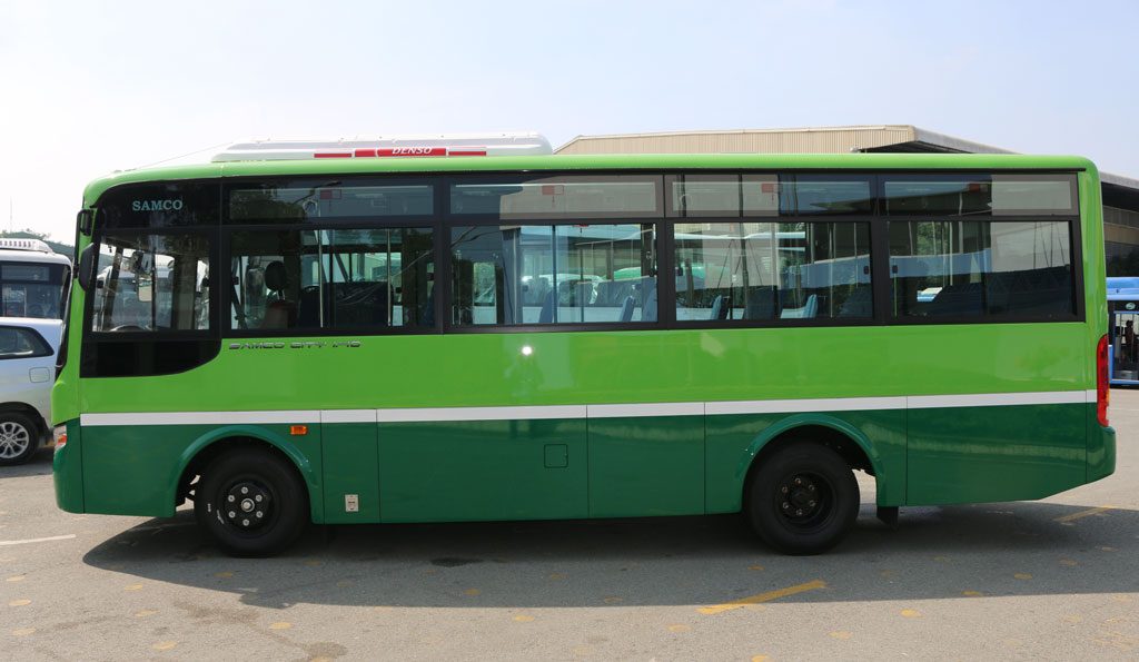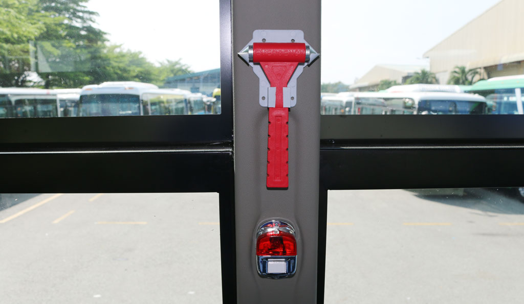 | Trang thiết bị tiêu chuẩn khác Other standard equipment | Chuông báo dừng, Bình cứu hỏa, Kính chắn gió trước có bố trí chỗ lắp bảng đèn led; có dây nguồn chờ để lắp đèn led kính sau; Tay vịn, tay nắm treo theo tiêu chuẩn. Stop bells, fire extinguisher, box for Led plate, handdralls. |
