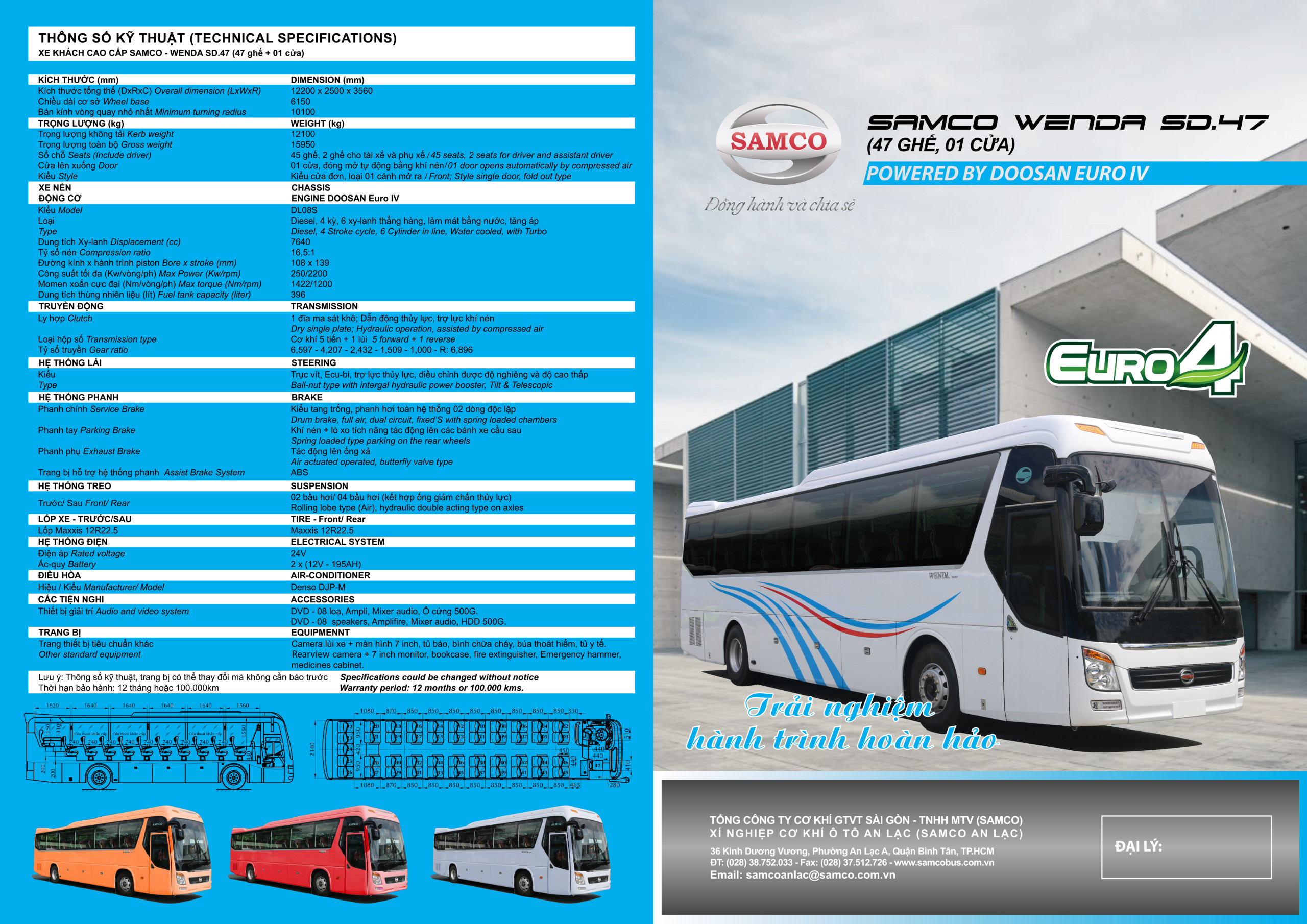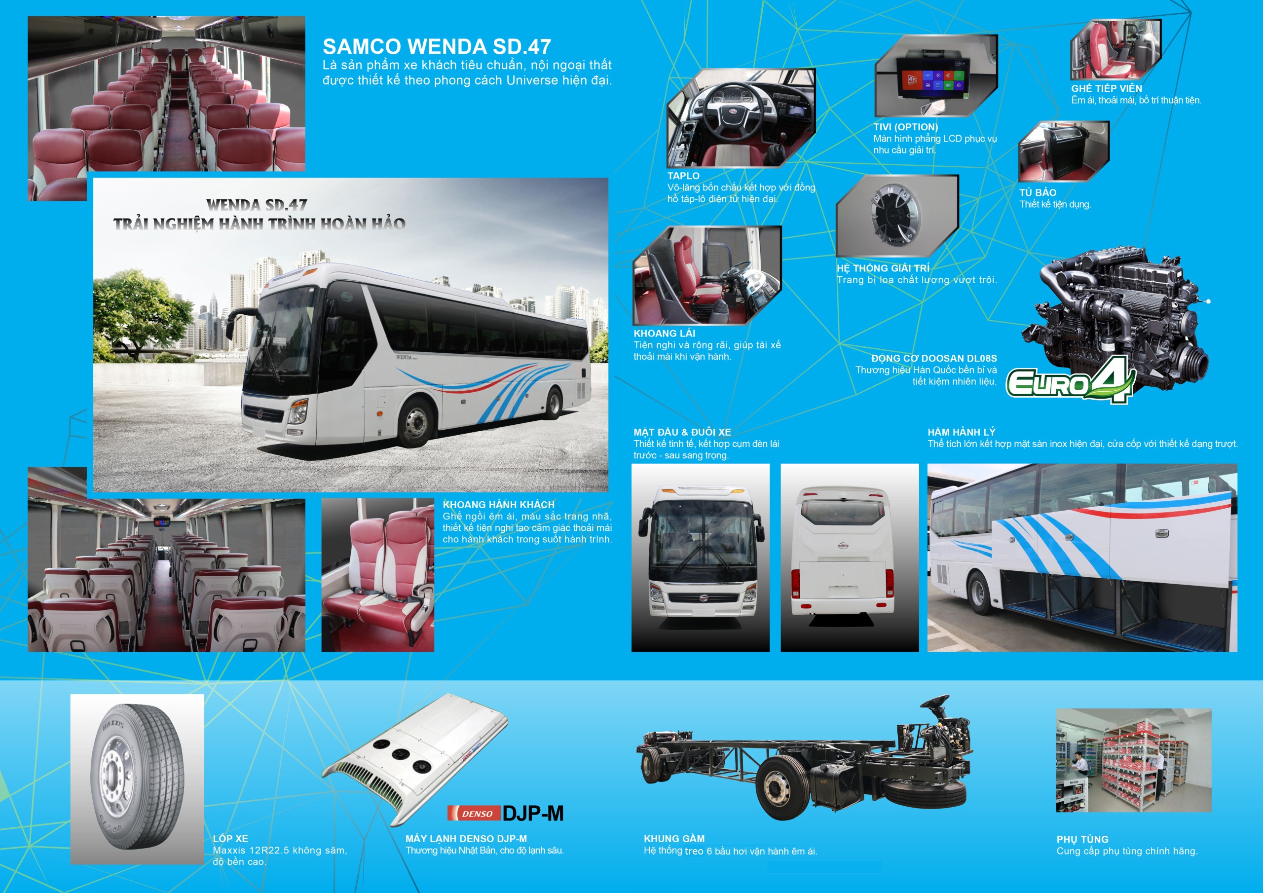 Xe khách SAMCO WENDA SD.47 sử dụng động cơ Doosan - Hàn Quốc mạnh mẽ và bền bỉ, với thiết kế nội thất tiện nghi phù hợp cho các hoạt động kinh doanh hợp đồng - du lịch, đưa đón cán bộ công nhân viên.